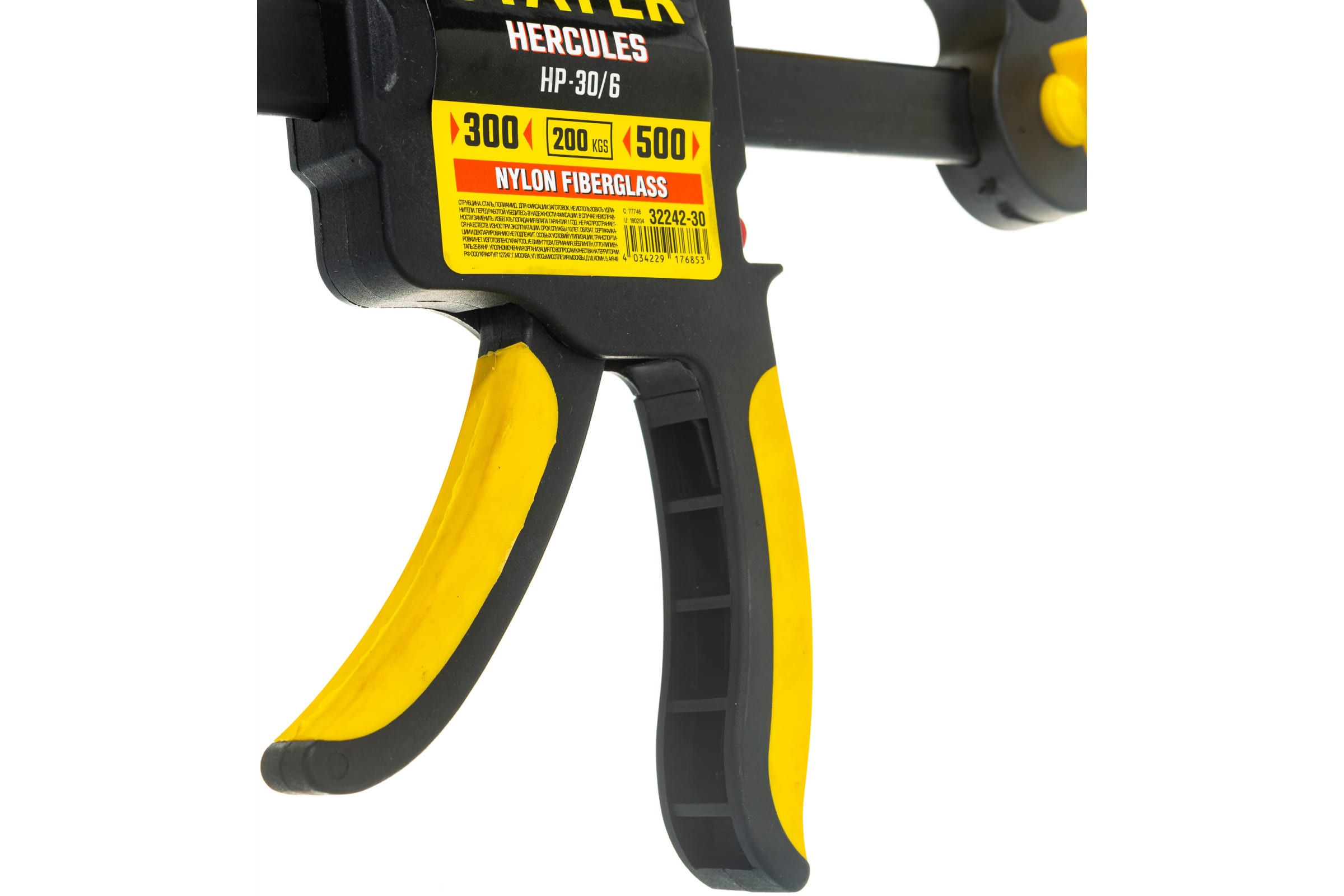 - Переставная конструкция ручной пистолетной струбцины STAYER PROFI 300 мм 32242-30 для сжатия и распора;